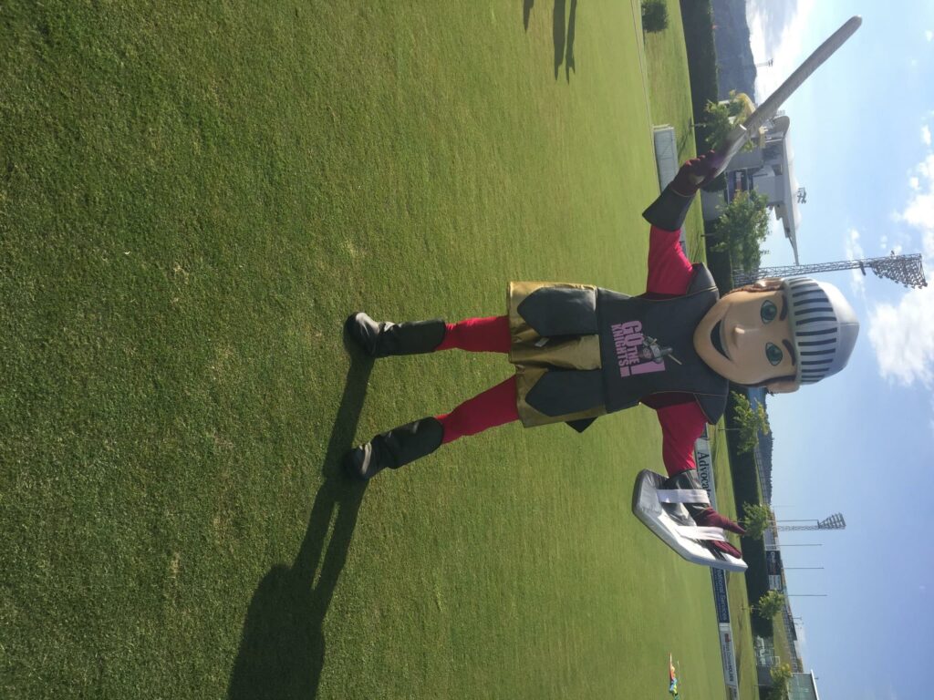 I was doing a fielding drill with Scott Kuggeleijn but Mark drew the really short straw! He had to dress up as the team mascot for two hours. It was a fun evening all round made all the better with Mark walking around dressed as a knight and taking photos!